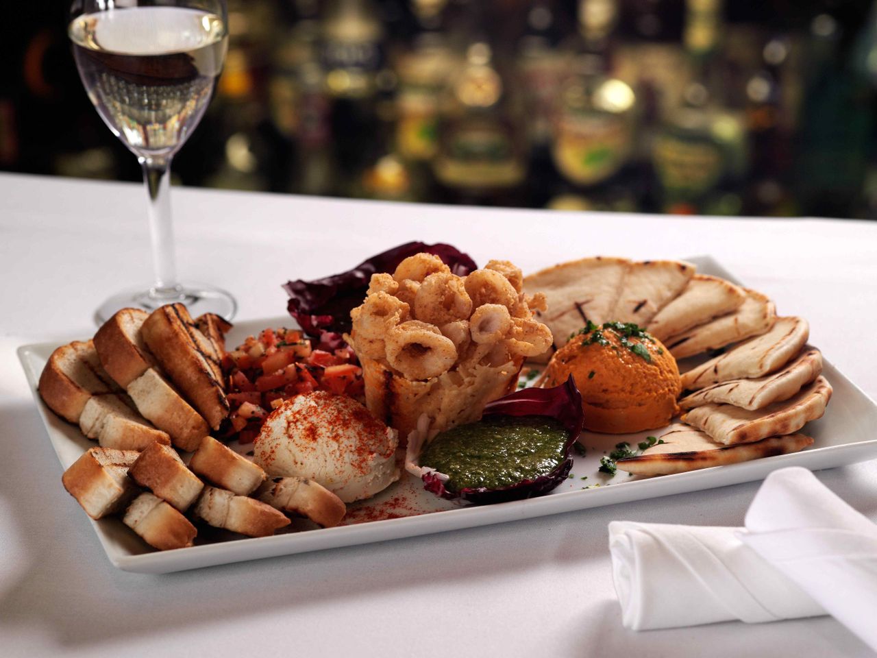 - The Appetizer Platter has a delicious combination of calamari, goat cheese, and bruschetta.