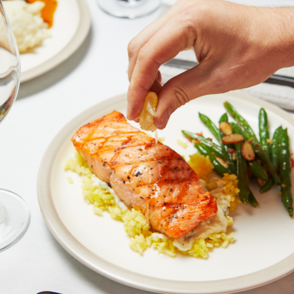 Atlantic Salmon – Fresh-caught Atlantic salmon expertly marinated and grilled. Served over a rich cilantro beurre blanc with savory saffron risotto and seasonal vegetables.